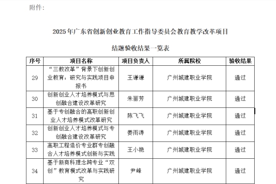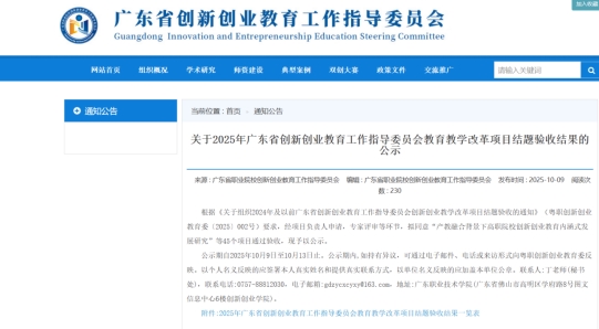 近日,广东省创新创业教育工作指导委员会对2025年度广东省创新创业教育工作指导委员会教育教学改革项目的结题验收结果进行公示。我校6个项目均顺利通过验收。